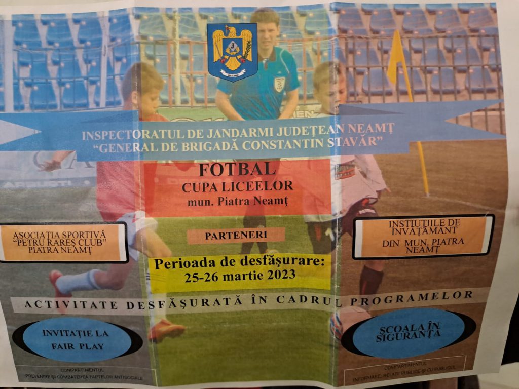 CUPA LICEELOR – FOTBAL, organizată de Inspectoratul de Jandarmi Județean Neamț, activitate desfășurată în cadrul Programelor ” ȘCOALĂ IN SIGURANȚĂ ” – INVITAȚIE LA FAIR PLAY”.